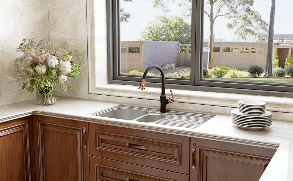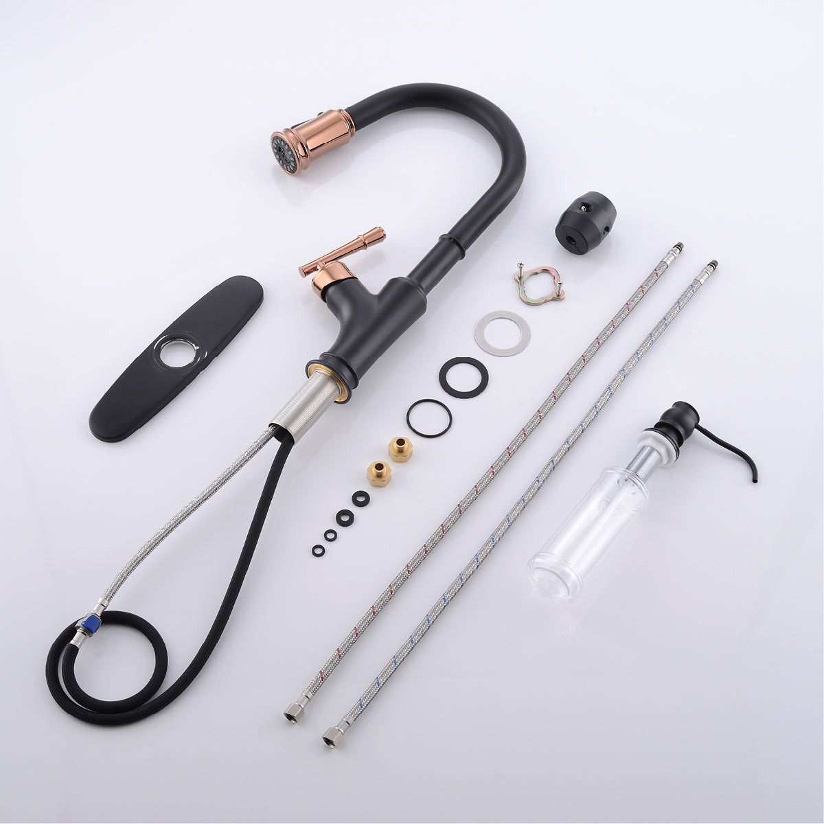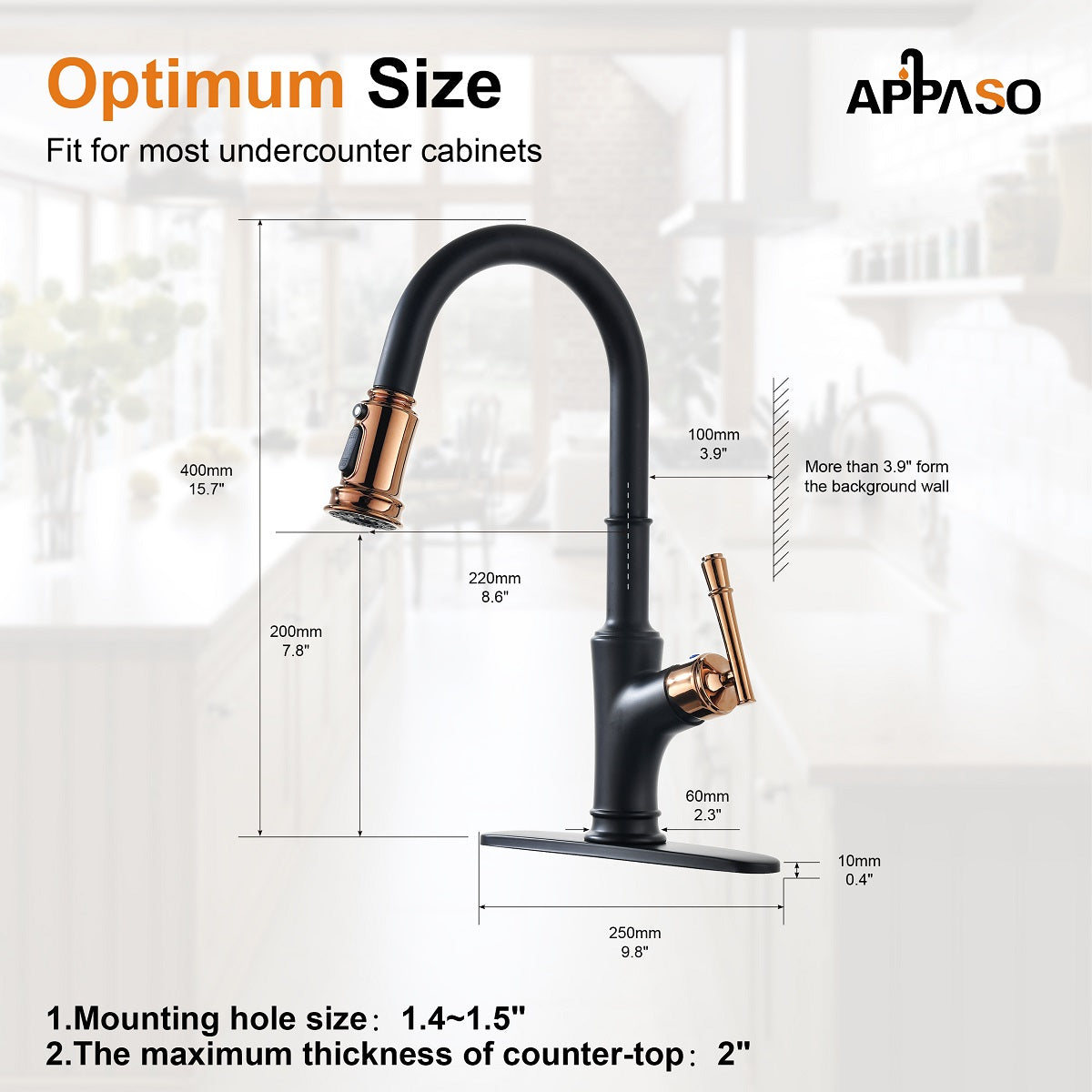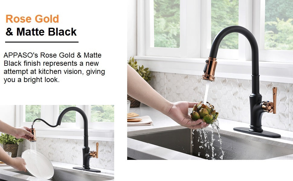 APPASO 135BRG Pull Down Kitchen Faucet Matte Black Rose Gold High Arc with Magnetic Docking Sprayer